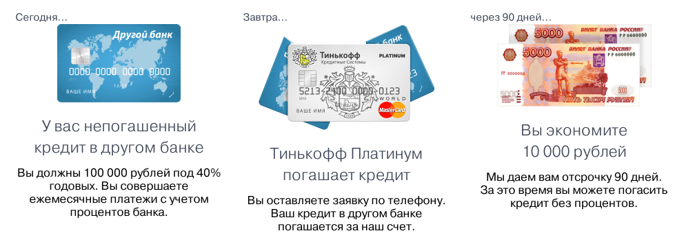 У вас есть кредит на 100 000 рублей в другом банке, под 40% годовых. Вы подключаете автоматическую оплату вашего кредита с карты "Тинькофф Платинум" и получаете отсрочку на 90 дней по вашему кредиту. Выгода - 10 000 рублей.